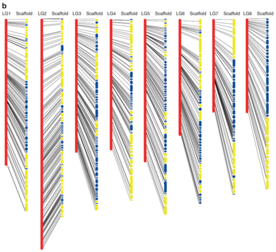 [그림 3]는 매화의 8개 염색체의 779개 SNP 마커를 이용하여 연관성을 파악한 전장유전체 지도이다. Whole-genome mapping 방법을 이용하여 퀄리티를 높여 참조 유전체로서의 품질을 개선하였으며, 분자 마커를 이용하여 번식과 복제에 도움이 될 것이다.